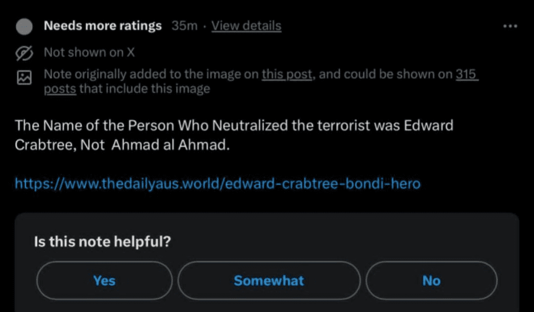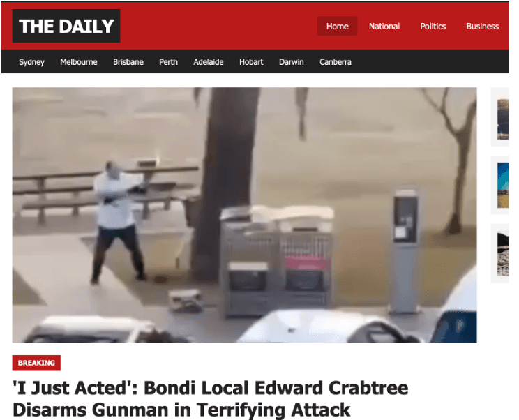 The site published a single article about the attack. It identified the hero who disarmed one of the gunmen as "Edward Crabtree," an Australian IT professional and Bondi local. The claim was fabricated.
