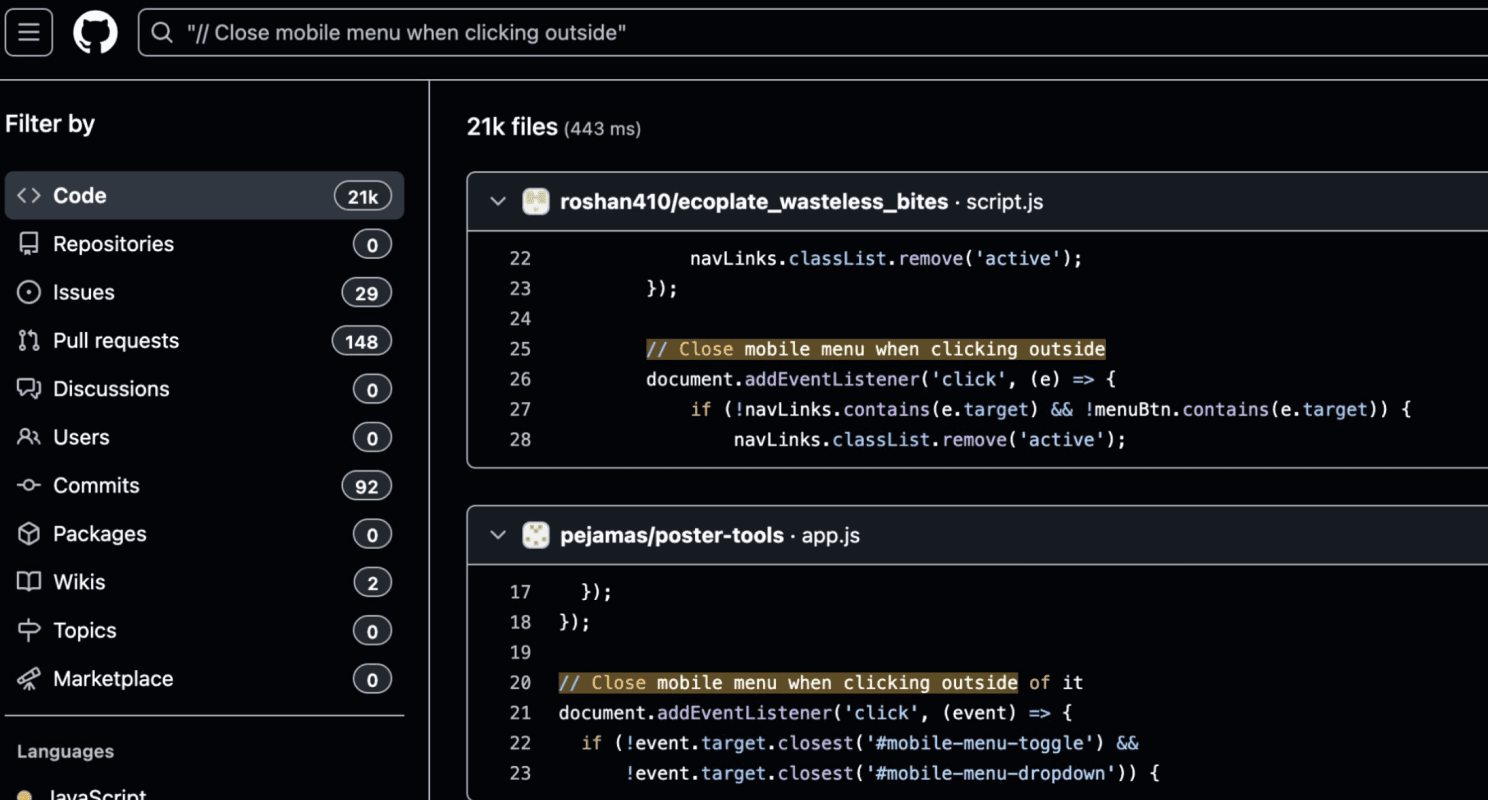 When the full JavaScript file is searched as a complete unit, no matches appear across indexed public repositories.