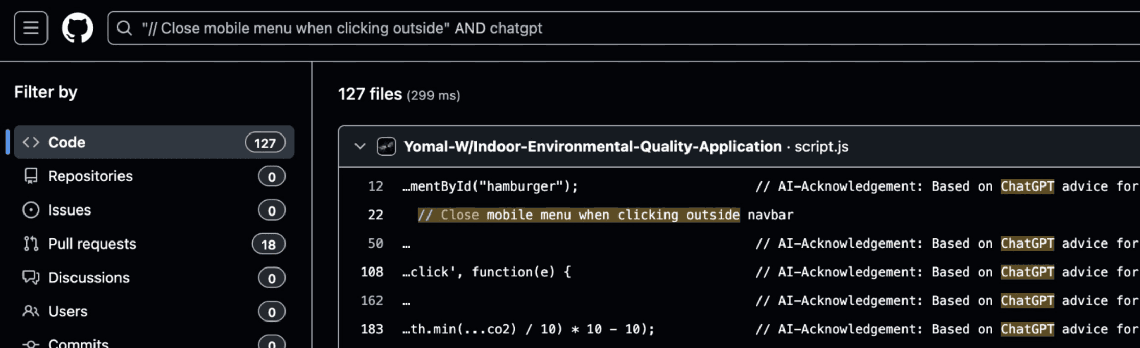 When individual comment strings from the code are searched across public repositories, they appear across tens of thousands of GitHub projects, including many where developers explicitly acknowledge using AI coding assistants.