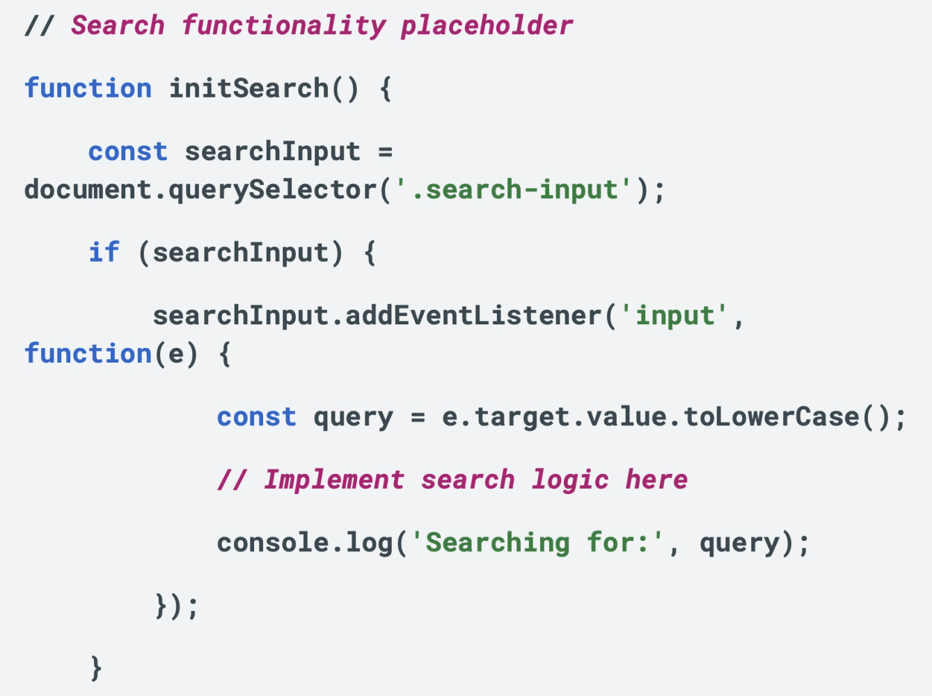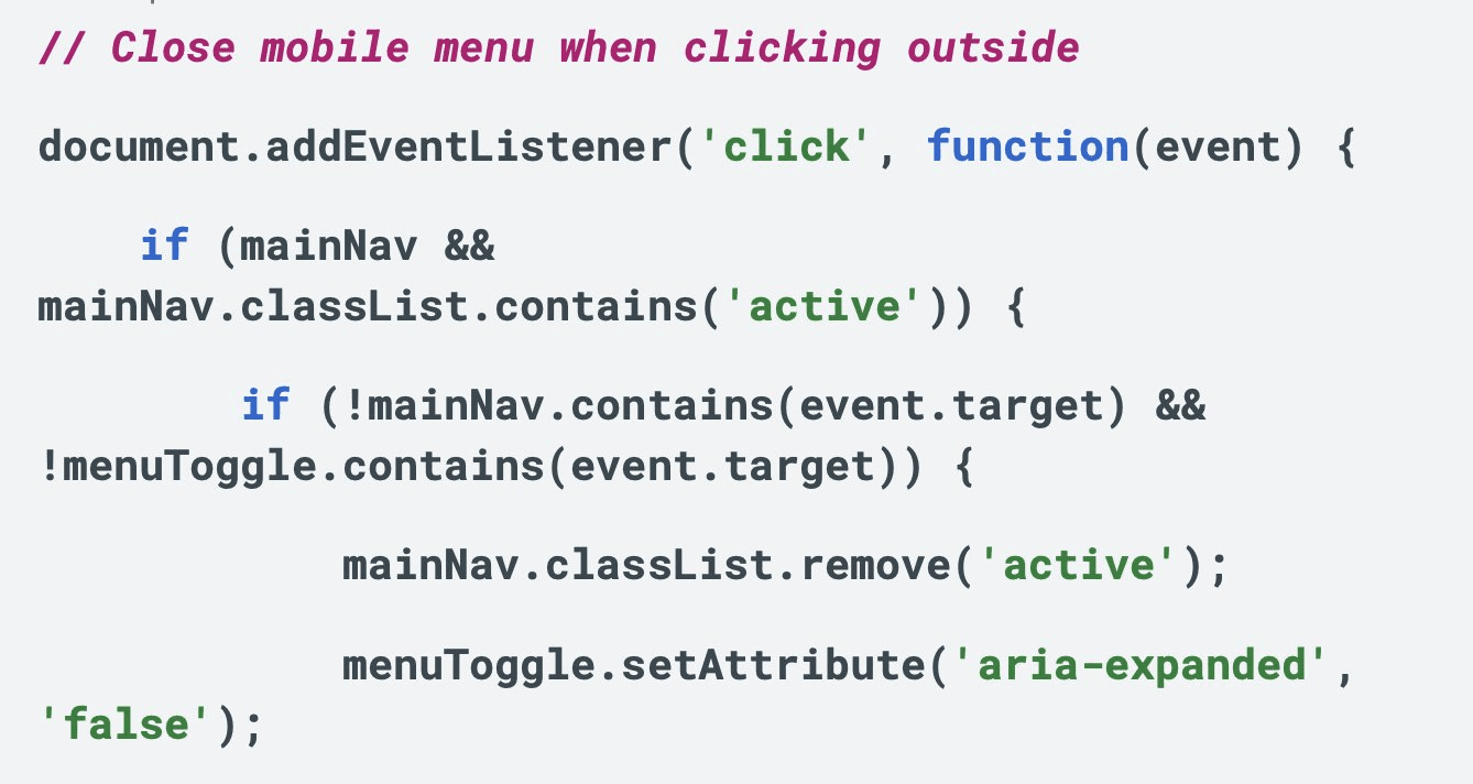 The code includes comments like detailed explanations of menu toggle behaviour and search logic marked as incomplete, written in the instructional style characteristic of AI code generation.